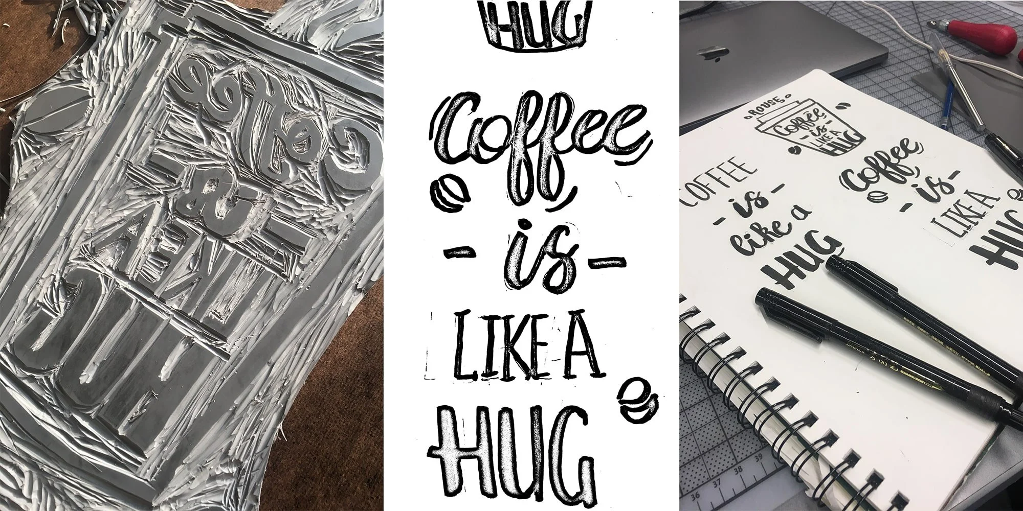I had a blast creating lino print posters with the quote “Coffee is like a hug.” This hands-on process of sketching, carving, and printing really brought out the cozy, handmade vibe I wanted to capture. It’s a little imperfect but that’s what gives it character, just like a great cup of coffee. This was definitely one of my favorite parts of the project, as it added a personal and authentic touch to the brand.