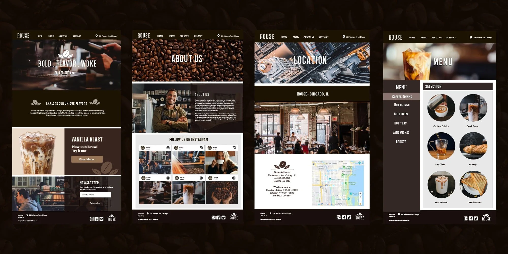 Rouse is a personal design project I developed, imagining a serene coffee shop located in the heart of Chicago. This conceptual work delves into how intentional design—utilizing soothing colors and textures—can create a welcoming and cozy environment amid the city's fast-paced energy. Through this project, I was able to explore brand identity, customer experience, and the role design plays in shaping atmosphere, blending my love for both beauty and practicality.